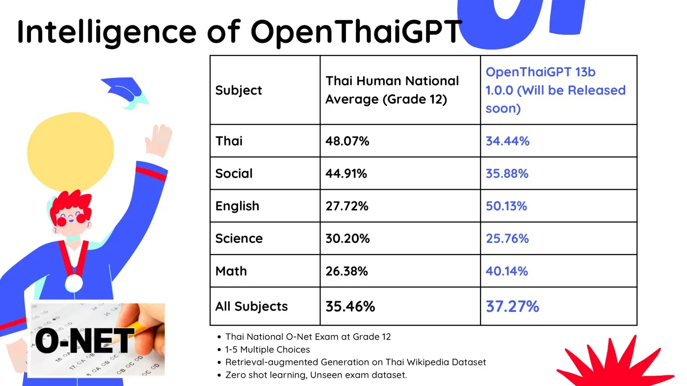 ดร.กอบกฤตย์ ยังแย้มอีกว่า OpenThaiGPT กำลังฉลาดๆ ขึ้นเรื่อยๆ ล่าสุดทีมพัฒนาลองเอาข้อสอบ ONET ระดับชั้นมัธยมศึกษาปีที่ 6 ให้ทำแล้วได้ผลคะแนนมากกว่าค่าเฉลี่ยที่เด็กไทยสามารถทำได้อีกด้วย ไม่เพียงแค่นั้น OpenThaiGpt ยังเก่งภาษาอังกฤษด้วย ไม่แค่ถนัดภาษาไทยอย่างเดียว
